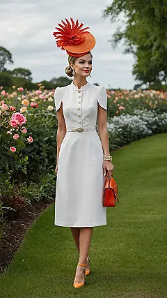 Getting ready for the derby means pulling out all the stops and definitely finding a hat that’s basically a work of art you wear on your head. Sometimes it feels like the real competition isn’t the horse race, but who has the most fabulous, over-the-top headwear! Finding the perfect derby outfit for women, like this sharp white dress with that amazing orange pop, is all about looking like you belong front and center, even if you’re just trying not to spill your soda while watching the finish line.
