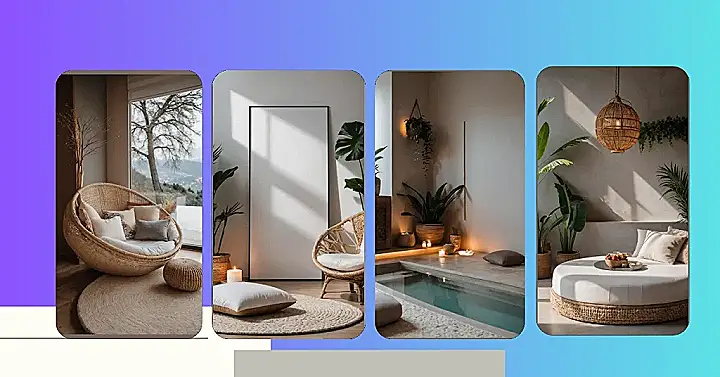 Check out the whole scene – those big green plants are probably silently judging how much caffeine you’ve had today, while providing some cool, leafy energy. That rug is so cozy, you might actually consider taking a nap right there on the floor (we won’t judge!). And the cool hanging thingy? It’s like the room’s personal chill-out assistant, making everything feel extra relaxed. This is your official “do not disturb, excellent napping in progress” zone.