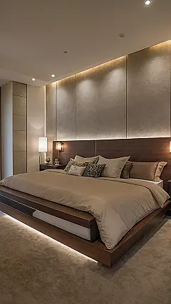 This king bed room set isn’t just about epic sleeping space; it’s a whole vibe! Notice how the sleek wooden headboard blends right into the wall, complete with subtle, warm lighting that practically whispers, ‘Relax.’ It’s like the designers knew exactly what you needed to escape the chaos of the day, whether you’re studying, scrolling, or just pretending to be an adult. With all that space and those chill lights, this room is basically a five-star resort tucked away in your house, perfect for recharging your superpowers before facing another school week!