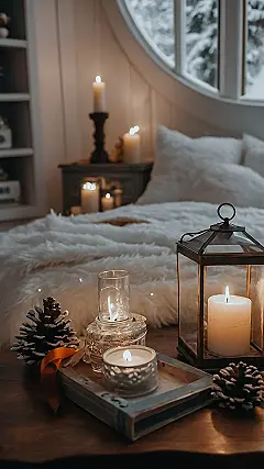 This picture screams “winter room decor” in the best way! Imagine curling up on that fluffy bed with a book, a mug of hot cocoa, and the soft glow of candlelight all around you. It’s the perfect way to chase away the cold and enjoy a relaxing evening. Plus, the candles add a touch of magic and make everything feel extra cozy. Even that pine cone looks like it’s getting in on the action!