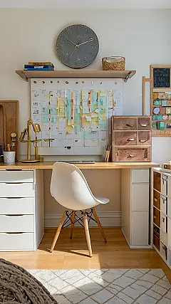 Check out this craft room office – it’s like a superhero headquarters for DIY projects! With all those drawers and that calendar exploding with sticky notes, it looks like the perfect spot to plan your next masterpiece. Maybe you’re plotting a glitter bomb attack on your bestie (just kidding… mostly), or designing the most epic Halloween costume the world has ever seen.