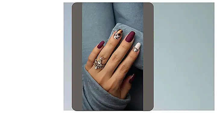 These simple acrylic nails are totally giving off cozy sweater vibes! That matte burgundy color is like the pumpkin spice latte of nail polish. And those little leaf designs? Super cute! It’s like your nails are ready to jump in a pile of crunchy leaves, maybe even rake them up later (if you’re feeling ambitious, but those nails are too pretty for chores!).