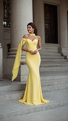 Then there’s that amazing dramatic flowing bit on her arm – is it a super long sleeve, a mini cape, or just a very stylish yellow cloud that decided to hang out? Whatever it is, it makes this evening long dress look like it’s ready for some serious wind machine action, or maybe even a superhero landing. Just try not to accidentally knock over any fancy appetizers with it when you’re reaching for a cupcake! And walking down those grand stairs in this gorgeous number? That’s not just a walk, that’s a graceful performance. Just remember to lift the hem, or you might end up sweeping the entire venue floor before you even get to the dance floor!