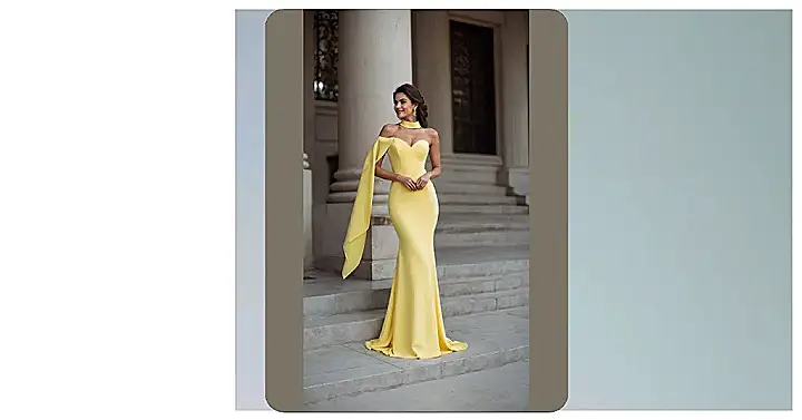 Then there’s that amazing dramatic flowing bit on her arm – is it a super long sleeve, a mini cape, or just a very stylish yellow cloud that decided to hang out? Whatever it is, it makes this evening long dress look like it’s ready for some serious wind machine action, or maybe even a superhero landing. Just try not to accidentally knock over any fancy appetizers with it when you’re reaching for a cupcake! And walking down those grand stairs in this gorgeous number? That’s not just a walk, that’s a graceful performance. Just remember to lift the hem, or you might end up sweeping the entire venue floor before you even get to the dance floor!