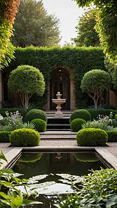 And check out that cool fountain doing its water thing right in the middle, leading down to that calm pool. You could probably meditate here, or at least pretend you’re in a movie scene where someone dramatically throws a coin in and makes a wish for unlimited pizza. It feels like a secret green escape, fancy but chill, the kind of place where you could hide from homework or just admire how organized nature can be when someone tells it what to do.