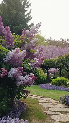 Walking past a scene like this must be like stepping into a perfume factory that only makes amazing smells, but instead of machines, it’s just tons of happy flowers doing their thing. These lilac garden landscapes are so packed with blooms, you might actually bump into a branch just trying to get closer to sniff them, or maybe accidentally photo-bomb a bee having the best day ever. They’re so full, they look like they might just spill over onto the path! It makes you wonder if they practice their group poses or just naturally look this fabulous.
