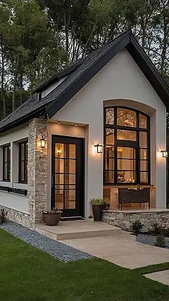 Those massive arched windows aren’t just for looking fancy; they’re basically a giant welcome sign for sunshine, probably making the inside feel like a perpetually bright, super chill hang-out zone. Imagine trying to throw a party here – everyone would be talking about how epic your house is! The way the classic stone mixes with sleek black frames and big doors gives it this awesome ‘timeless cool’ vibe, proving that unique design doesn’t have to be weird, just really, really impressive. Plus, walking through that grand entrance would make you feel like royalty, even if you’re just coming home to raid the fridge.