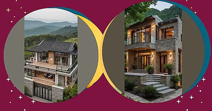 This isn’t just a house; it’s practically a level-up in architectural awesomeness! With its cool stone walls, massive windows, and balconies that seem to float, this place is definitely rocking a unique house design that’s anything but basic. It looks like it could host a secret super-spy meeting one minute and a chill movie night the next, all while probably making the neighbors wonder if a famous rock star or a tech billionaire just moved in. You can almost hear it whispering, “Yeah, I’m this cool, what about it?”