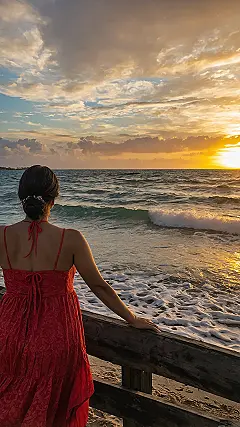 Looking at beach photos like this one makes you instantly want to teleport there, right? That red dress against the insane sunset colors looks like something straight out of a movie scene. You’re standing there, hand on the railing, probably trying to look all deep and thoughtful, hoping the camera captures the perfect golden hour glow. But let’s be real, moments before or after this shot, you were probably fighting off a gust of wind trying to turn your dress into a kite or wondering if that patch of seaweed was actually moving.