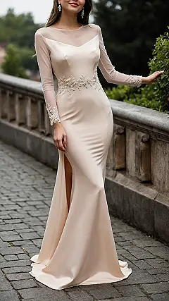 And let’s talk details! Those sheer sleeves with their delicate lace cuffs are giving major “enchanting fairy princess” energy, while the sparkly belt cinches everything just right, making sure you’re shimmering from every angle. Plus, that sneaky high slit? It’s not just for showing a little leg; it’s practically a secret weapon for navigating stairs or gracefully escaping your overly enthusiastic aunt on the dance floor. Just try not to get *too* distracted by how gorgeous the fabric drapes as you strut your stuff!