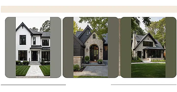 Looking at this house, you might think a knight in shining armor is about to ride out, but nope! This is a “Modern Tudor” home, which basically means it’s got all the cool, classic vibes of those old-timey European castles but with a major glow-up. See those dark timber frames on the light walls? That’s the signature Tudor look, but with these giant, sleek black windows and sturdy stone base, it’s definitely not stuck in the past. It’s like your favorite history textbook got a really awesome, stylish movie adaptation!
