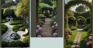 Stumbling upon that stone archway feels like finding a secret entrance to somewhere awesome, and that little wooden hut by the tree? Definitely looks like the perfect spot for plotting adventures or just hiding from chores. It’s like nature decided to throw a party and invited a few cool buildings along for the ride. This isn’t your grandma’s neat little flowerbed; this is where the plants might secretly be planning world domination, but they’re doing it in a really beautiful, chill environment.