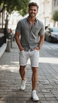 This guy clearly got the memo that summer fashion is all about looking effortlessly cool, especially when it comes to mens shorts. He’s rocking those khaki numbers like they’re tailor-made for conquering warm weather with maximum style and minimum sweat. While some of us are still figuring out how to look decent after a five-minute walk in the sun, he’s out here making shorts and a button-down look like a runway outfit, probably without even trying. It makes you wonder if those shorts come with a built-in confidence booster.
