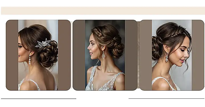 Think about it: an updo like this is basically your secret weapon against bad hair days at a wedding. No more battling flyaways or accidentally dipping your hair in the soup (it happens!). This elegant style not only keeps you looking super put-together from the ‘I do’s’ to the last dance but also means you can show off those killer earrings, just like the sparkling ones in the picture. It’s all about looking fabulous, feeling comfy, and making sure your hair isn’t the reason you miss the bouquet toss because you’re busy trying to untangle a knot.