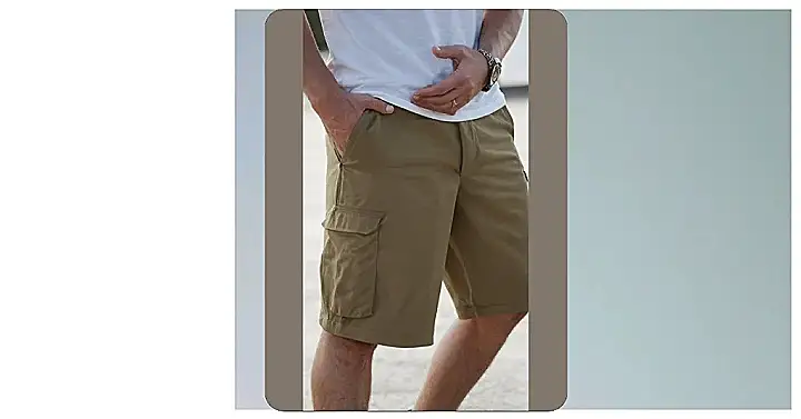 This guy clearly woke up and chose ‘awesome adventure’ with his stellar mens shorts. He’s flashing a grin that says, “Yep, I’m ready for anything the day throws at me, probably with a snack hidden in one of these bad boys!” Those olive green cargo shorts aren’t just about looking good; they’re practically a mobile command center. Imagine never having to ask a friend to hold your phone or losing your earbuds because you’ve got pockets galore. They’re basically your best bud for stashing all your summer essentials, from sunscreen to that emergency packet of gum.