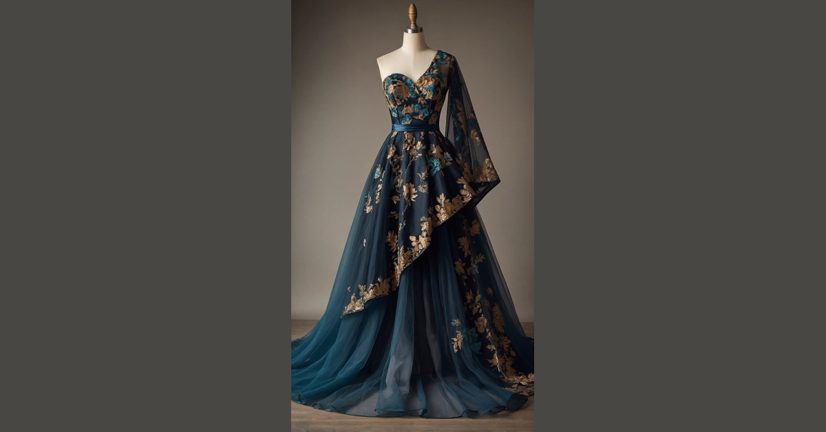 Looking for prom dresses 2025? Get ready to have your jaw drop because dresses like this one are basically saying “Hello, I’m here to look fabulous!” Imagine gliding into prom night wearing something this amazing, with shiny gold patterns and cool blue flowers making you feel like royalty. It even has that dramatic flowy sleeve that’s perfect for pretending you’re in a music video. Finding your perfect 2025 prom dress is definitely an epic quest, but spotting a gem like this makes all the trying-on sessions worth it.