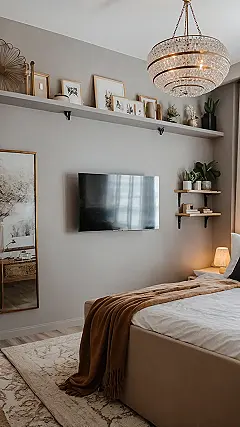 Suddenly, your space isn’t just where you sleep; it’s like your personal HQ, ready for anything. Check out that blingy light fixture and all those cool decorations on the shelves – they make the room feel way more legit than just posters taped everywhere (though those are cool too!). It’s amazing how adding some simple shelves for plants or changing up the lighting can make you feel like you’re living in a magazine spread, even if your biggest achievement today was finding both socks.