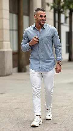 Now, let’s talk about those crisp white pants and matching sneakers. Wearing white can be a bold move – one wrong move with a rogue ketchup packet and your day is instantly over! But when you pull it off like this dude, it elevates the whole shirt outfit from “nice” to “wow.” It’s a clean canvas that makes the blue shirt pop, and those sneakers just complete the vibe, saying, “Yeah, I look good, and I’m comfortable enough to walk around all day showing it off.” It’s proof that a simple shirt and trousers, when put together right, can make you feel like a million bucks, even if you’re just headed to grab a smoothie.