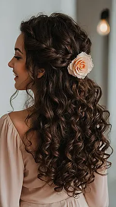 Then, just when you thought this look couldn’t get any easier or more charming, in comes a beautiful flower, sitting perfectly like a little crown! It’s the ultimate hack for making your already amazing curls feel extra special without any extra fuss. That simple rose isn’t just a pretty accessory; it’s like a secret signal that says, “Yes, I woke up looking this fabulous, thank you very much.” So go ahead, let your curls shine, add a pretty bloom, and get ready to conquer your day with confidence and serious style.