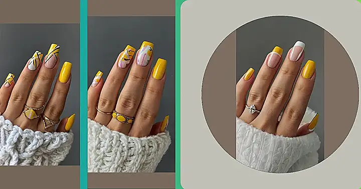 These nails are screaming “trust fund baby who aced their exams!” I mean, look at that sunshine yellow – it’s basically a gold bar dipped in lemon. And the French tips with those cool geometric shapes? Totally subtle, totally classy, and definitely says, “My allowance is bigger than your college tuition.” You could flash these babies at a country club and nobody would even bat an eye.