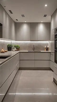 Wow, look at this kitchen! It’s got that total “modern design” vibe going on, all smooth grey cabinets and shiny gold handles that look like fancy jewelry. It’s so clean and perfect, it almost feels like stepping into a science lab instead of a place you’d accidentally spill juice. You can picture yourself trying to whip up something epic in here, but mostly just being scared to touch anything because it’s *that* sleek. It’s definitely not your grandma’s kitchen with cluttered counters and mysterious smells!