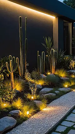 Who knew a desert full of spiky friends could look this cool after sunset? This isn’t just any garden; it’s practically a red carpet for cacti, complete with spotlights making them feel like total superstars. With those tall, dramatic silhouettes standing guard and little lights popping out of the fluffy grass, it’s like Mother Nature decided to throw a fancy glow-in-the-dark party. You could totally imagine hanging out here, sipping a smoothie, and pretending you’re in a super secret desert hideaway – definitely hitting the ‘dream garden’ vibe for anyone who likes a touch of drama with their greenery.
