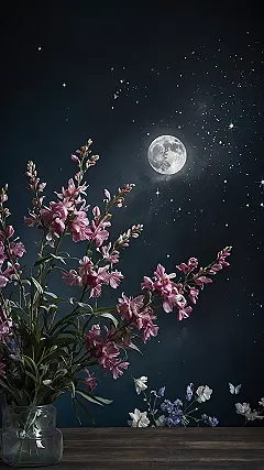 And check out these flowers! They’re not just any flowers; these are the VIPs of the garden, all dressed up in their best pink and purple outfits, chilling under the moonlight like they’re having a secret late-night party. Even the little blue butterfly decided to crash the gathering, probably thinking this is the coolest spot in the universe for a midnight snack. This wallpaper is so perfectly ‘aesthetic,’ it’s like it graduated top of its class in chill vibes and good looks, making sure your screen is always serving up a slice of serene, star-dusted beauty.