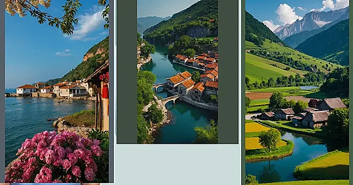 Wow! Look at this picture—it’s like stepping into a fairytale! Imagine living in a cute little village nestled right next to a sparkling blue river, with tiny orange-roofed houses all lined up like cheerful dominoes. The bridges look like they’re straight out of a storybook, perfect for strolling across and maybe even bumping into a friendly goat or two! It’s the kind of place where you’d forget all about homework and just spend all day exploring the gorgeous scenery. Seriously, could this village get any more beautiful?