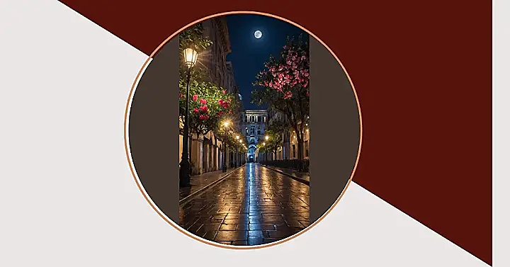 Wow, look at this street! It’s got that full moon hanging up there like a giant pearl, totally stealing the show. Those lampposts are doing their best to compete, making the wet ground all shiny and reflective, like a mirror for your feet. And check out those trees bursting with pink flowers – they’re practically posing for the camera under the lights. It’s the kind of scene that makes you feel like you should be wandering down this path with a mysterious secret, or maybe just heading out for pizza. Definitely fits the ‘pretty’ part of the keyword, right?