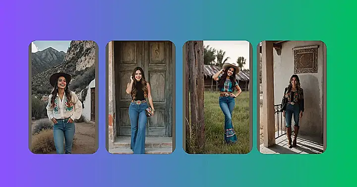 Let’s talk about those jeans! Forget your basic skinny jeans; these flared beauties with their matching vibrant embroidery at the bottom are next level. They connect perfectly with the traditional Mexican rancho style, but with a super fresh twist. You almost expect her to do a little happy dance, showing off those amazing details as she struts through the tall grass. Whether she’s heading to a fiesta or just making a trip to the feed store look like a runway show, this whole look proves that ‘country chic’ can be incredibly stylish and fun. It’s an outfit that says, ‘I might get my boots a little dusty, but I’ll look fabulous doing it!’