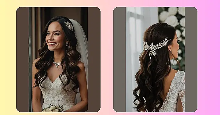 Planning your wedding hair can feel like trying to solve a Rubik’s Cube blindfolded! But guess what? This half-up style is like the cheat code. It’s sophisticated enough for walking down the aisle, but still lets your gorgeous hair flow freely. Plus, that sparkly hairpiece is totally stealing the show! You’ll be sparkling brighter than the disco ball at the after-party!