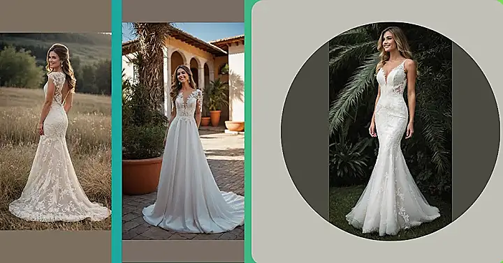 Forget all those boring dresses you’ve seen; this one is practically screaming ‘top wedding dress of the year!’ Just look at that intricate lace on the bodice – it’s so fancy, it probably took a team of tiny, super-skilled fashion elves to create. And that flowing skirt? It looks so light and dreamy, you’d swear she’s about to float off into the beautiful sunny background. This is definitely the kind of gown that makes everyone stop scrolling and say, “Whoa, where do I get one of those?”