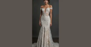 This stunning wedding dress is basically what happens when elegance meets “I’m ready for my close-up!” Just look at those beautiful lacy sleeves and the intricate design that flows down the whole gown – it’s not just pretty, it’s probably what you dream about when someone says “top wedding dress.” This mermaid-style stunner, with its long train ready to sweep the floor, makes you want to practice your slow walk, even if it’s just to get another snack from the kitchen.