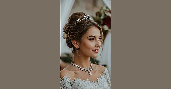 Just check out that majestic hair! It’s all swept up into a beautiful bun, probably secured with about a million bobby pins and enough hairspray to withstand a small tornado. Our star here is rocking a seriously sparkly tiara, making her look less like she’s getting married and more like she just stepped out of a fairytale, ready to claim her throne (or at least the dance floor). You know it took some serious magic and probably a few hours in the stylist’s chair to get that level of ‘I woke up like this, but better’ perfection.