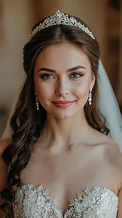 Get ready to swoon over what could easily be the star of best bridal hairstyles 2025! Just peek at this picture: those cascading waves, half-pinned back to show off that stunning bling. It’s like your hair is saying, “I’m fancy, but I’m also ready to celebrate!” This style gives you that regal, ‘I woke up like this’ glow, perfectly blending elegance with a touch of playful bounce. You won’t have to worry about looking stiff for photos; this hair is practically begging for a breezy outdoor shot, making every head turn with its effortless charm.