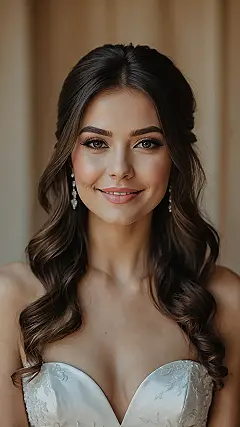 Let’s be real, a daytime wedding means you gotta battle the sun, maybe a sneaky gust of wind, and then later, bust some serious moves on the dance floor. This style seen here is practically a superhero for such events. The half-up part keeps things neat and tidy for those important “I do” moments, while the flowing curls down your back are ready to join the party when the DJ drops your jam. It’s the perfect balance: looking effortlessly glam while secretly being indestructible against the elements and questionable dance moves.