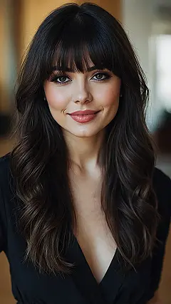 Check out the fantastic hair in this picture! Those lovely bangs perfectly frame her face, making her eyes look even more captivating and giving her a super confident, friendly vibe. It’s almost like her hair is whispering, “Hey there, world!” We’ve all had those mornings where our hair has a mind of its own, right? But a great set of bangs can seriously upgrade your whole look, making you seem effortlessly cool and put-together, even if your morning routine involved a frantic search for matching socks.