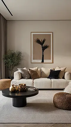 This room screams, “Chill vibes only!” Seriously, if stress could be a color, it definitely wouldn’t be anywhere near this beige-tastic paradise. I can already picture myself sprawled on that comfy couch, surrounded by enough pillows to build a fort of relaxation. You could practically meditate on the sheer calmness of this place, or at least binge-watch your favorite show without feeling guilty.