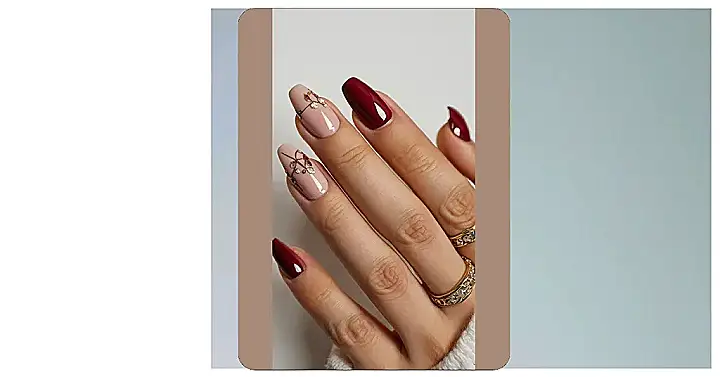 Who knew fall could look this glam on your fingertips? We’ve got two nails rocking a seriously vibrant, glossy red that practically dares autumn leaves to try and outshine them. Then, the other two are rocking a subtle nude base with these incredible golden vine-like patterns, almost like tiny, fancy grapevines or abstract autumn leaves decided to get all dressed up for a fancy party. These aren’t just nails; they’re tiny works of art that probably require a personal assistant just to avoid poking yourself when reaching for your phone!
