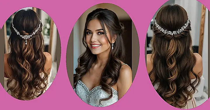 The bottom part of the hair in this photo is doing some seriously impressive wavy things. It’s not just straight or boring; it’s got these bouncy, perfect curls that probably took a team of tiny hair fairies hours to craft. This whole half-up, half-down vibe is super smart because you get the fancy braided bit and sparkle on top, but you also get to let your hair feel free and flowy down your back. It’s like having the best of both worlds – formal up top, party down below, and looking amazing the whole time!