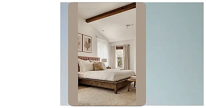 And get this, even the ceiling is showing off with those cool white beams and that sparkling chandelier – talk about sleeping under the stars, but indoors and way cozier. Those floor-length curtains look like they’re ready to block out the world (or at least your annoying sibling’s early morning noise). It’s like this whole look was designed to make you feel like a total VIP, no complex interior design degree needed. If you’re thinking about giving your space a serious glow-up, places with ‘rooms to go’ can totally help you snag a style this chic without having to spend all your weekend trying to match pillows and throw blankets. Just imagine waking up here – you might actually be excited to start your day… almost!