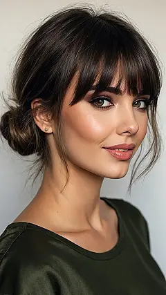 Check out the fantastic hair in this picture! Those lovely bangs perfectly frame her face, making her eyes look even more captivating and giving her a super confident, friendly vibe. It’s almost like her hair is whispering, “Hey there, world!” We’ve all had those mornings where our hair has a mind of its own, right? But a great set of bangs can seriously upgrade your whole look, making you seem effortlessly cool and put-together, even if your morning routine involved a frantic search for matching socks.