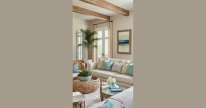 And peep those details! The stuff on the coffee table looks like cool treasures you’d find, way better than just boring old coasters. Plus, those wooden beams on the ceiling make the room feel extra special, like you’re in a cool, old boat house that’s been upgraded for maximum comfy points. Honestly, add a giant bowl of popcorn and this coastal chic spot is ready for movie night, study group, or just staring at the ceiling while thinking about absolutely nothing important. It’s proof that stylish can totally be snuggly.