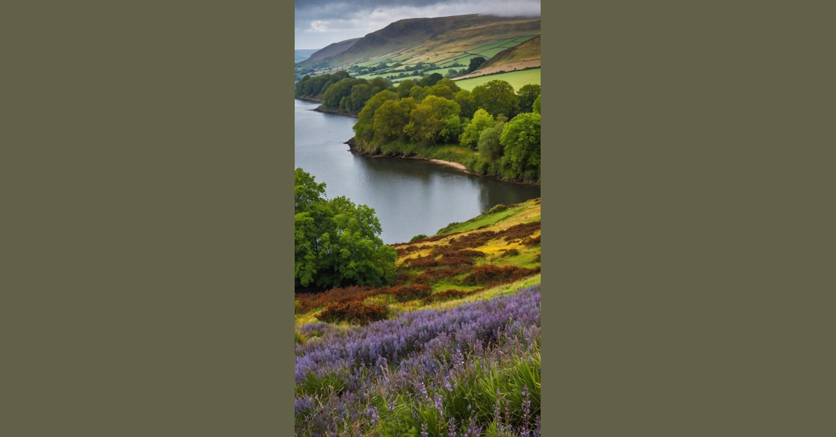 Wow, look at this! It’s like England decided to show off all its favourite outfits at once. You’ve got the fancy purple carpet laid out on the hill, like it’s ready for a celebrity arrival (maybe a sheep with a particularly fluffy fleece?). Then you have the big green hills in the background, all neatly patched up like a giant, comfy blanket, just chilling under a classic moody English sky. Down by the water, the trees are doing their best impression of fluffy green clouds. Seriously, trying to capture all this beauty with a camera for some epic England landscape photography must feel like you’ve hit the jackpot.