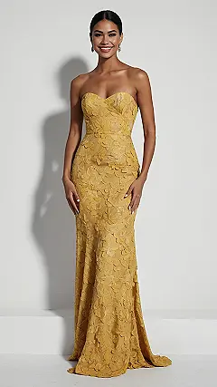 Forget about trying to decide between being bright and being fancy, because this butter yellow dress totally nails both! It’s got that sunny, cheerful vibe that just makes you smile, but then BAM – it’s also super elegant with its strapless design and flowy, floor-length skirt. The subtle floral patterns are like a secret garden party happening right on your dress, making it perfect for turning heads without yelling, “Look at me!” You’d totally feel like you’re glowing from the inside out in something this lovely.