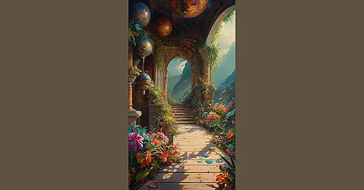 Wow, talk about an overachieving background! This isn’t just some blurry wall or generic gradient; it’s a full-blown, epic oil painting background that clearly didn’t get the memo about staying subtle. Look at that view bursting through the archway – mountains, sunshine, and so many flowers it looks like a confetti cannon exploded, but in a really artistic, non-messy way. Someone really went wild with the paint tubes creating this dreamy scene; it’s less ‘background’ and more ‘the actual destination I wish I was at right now.’