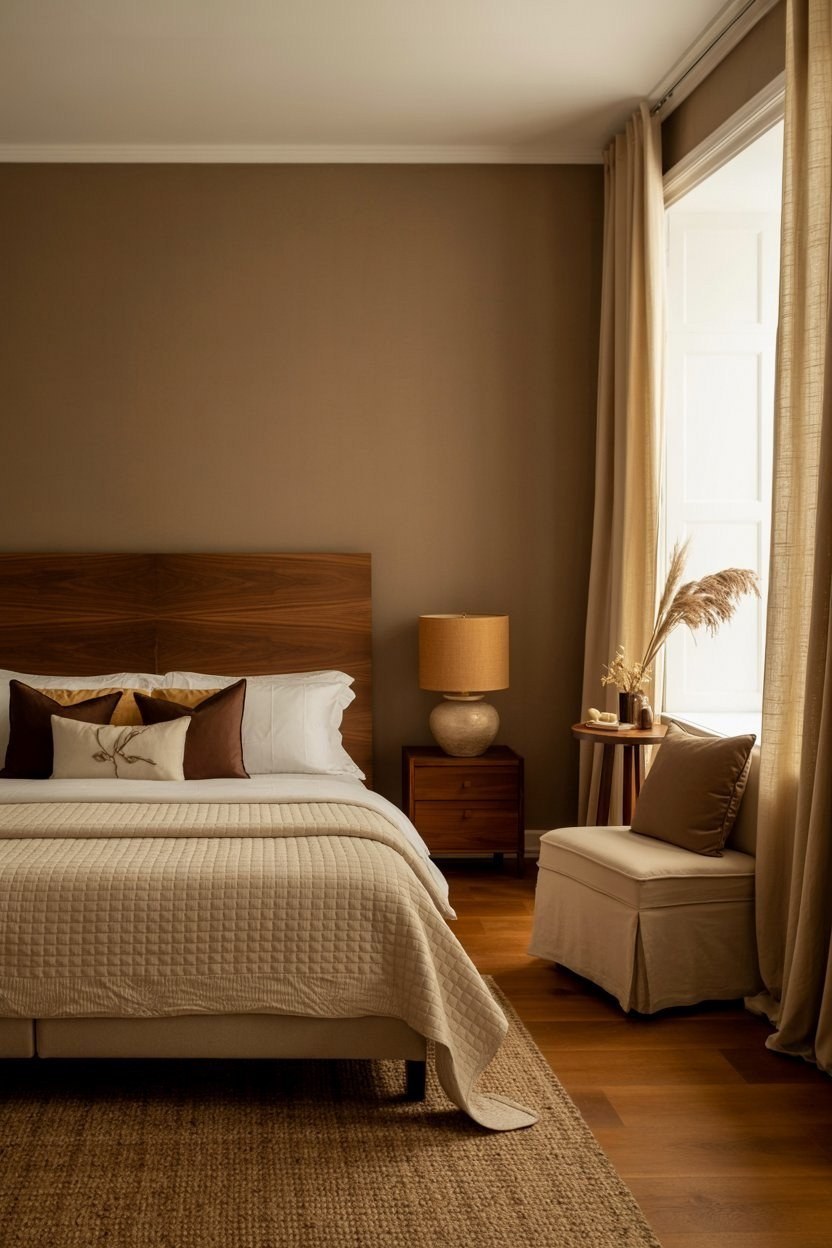 Sink into tranquility with this serene cozy master bedroom, bathed in warm #846c59 earth tones. Layered textures from a plush rug and thick curtains, alongside twin lamps, create an inviting ambiance.