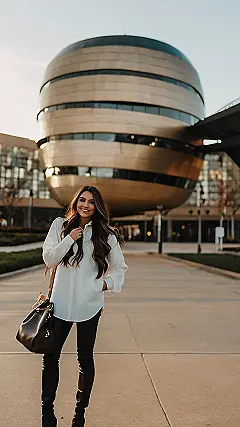This outfit is the perfect blend of comfy and classy – just like a cozy night at a winery! The girl in the picture looks like she’s ready for a night of wine tasting and good company, and her outfit screams fall vibes. The white top is super comfy and the leather pants add a touch of edginess. She’s got the perfect look for sipping on a glass of Cabernet Sauvignon while enjoying the crisp autumn air.