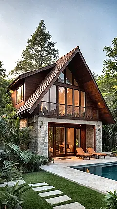 Forget those boring square houses! This tropical gem is basically a giant geometry problem solved by nature, standing tall with its super cool A-frame roof. With windows stretching all the way up, it’s like living inside a giant, fancy greenhouse, but instead of just plants, you get front-row seats to lush green trees and maybe even some squawking tropical birds trying to get your attention. Who needs a TV when your living room has a blockbuster, nature-documentary view 24/7, all thanks to some clever tropical house design that brings the outside in?