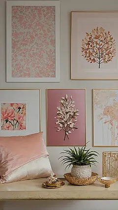 Seeing this wall makes you wanna ditch the posters held up with crumbling tape and actually frame stuff. Who knew flowers and trees could look so fancy? It’s like your room decided to grow up and get a glow-up, but still keeps it chill with all that pink and peach. Hanging these frames perfectly straight? That’s the real challenge, probably requires a spirit level and snacks for motivation, mostly snacks.
